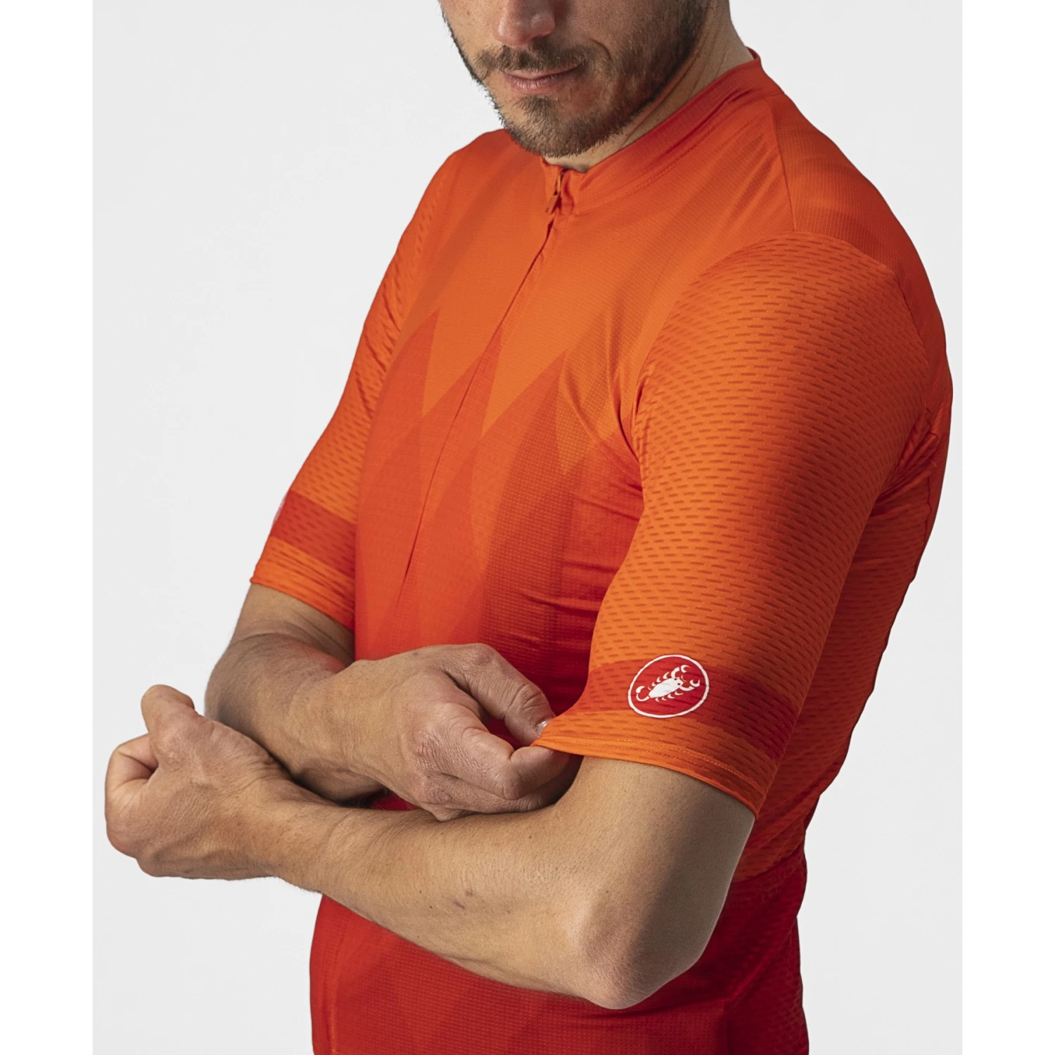 De A Tutta Jersey is gebaseerd op de nieuwe Competizione 2 basistrui. Castelli heeft de constructie bijgewerkt met de zijpanelen die eindigen in de zakken. Castelli heeft de stoffen bijgewerkt zodat de achterkant niet te veel uitrekt als je de zakken volpropt. Castelli heeft ook de mouwen en de pasvorm vernieuwd, met superstretch stoffen voor een geweldige pasvorm op elke lichaamsvorm zonder te strak aan te voelen.