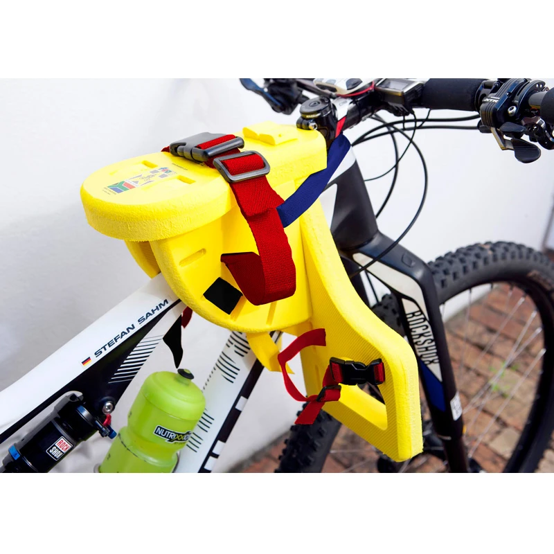 Omdat het zwaartepunt nog steeds tussen de twee wielen ligt, merk je nauwelijks verschil in rijgedrag. Het zadel is met 900 gram licht en kan op elke fiets met bovenbuis worden gemonteerd. Zelfs brede frames (bv. ebikes) zijn geen probleem. De bevestiging is eenvoudig en de stoel kan binnen enkele minuten zonder gereedschap worden gemonteerd of gedemonteerd. De rijbaan is beschermd. Het kind wordt bij de heupen en de voeten vastgezet met veiligheidsgordels.