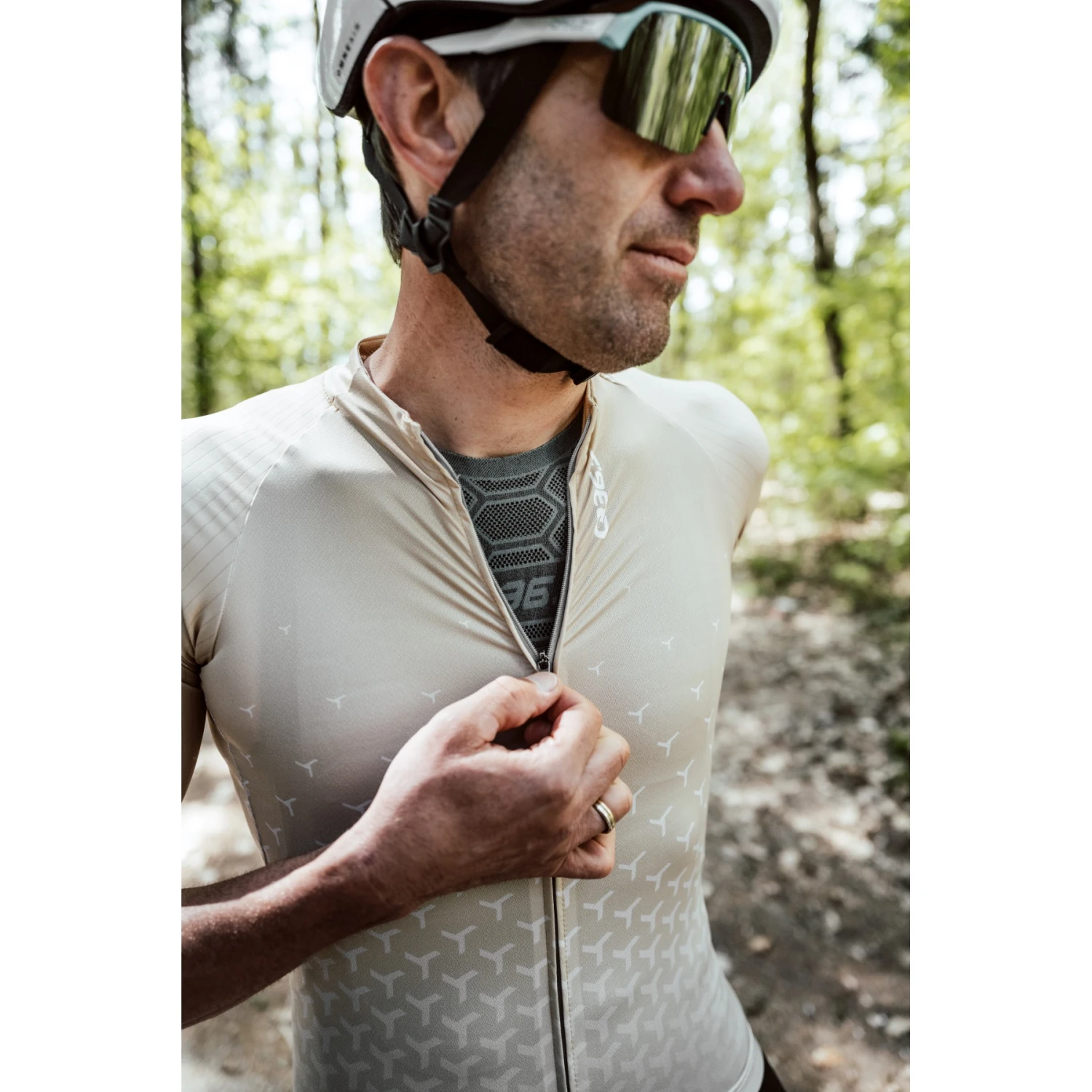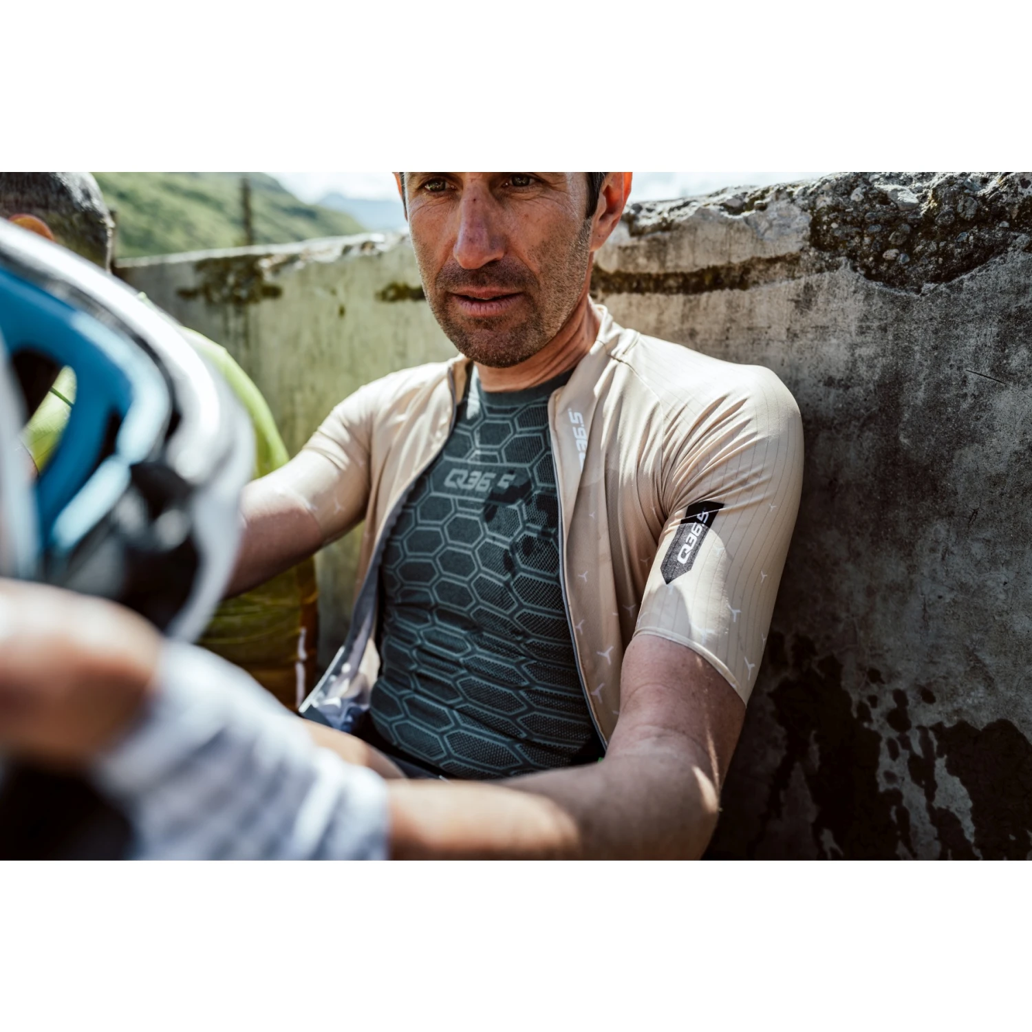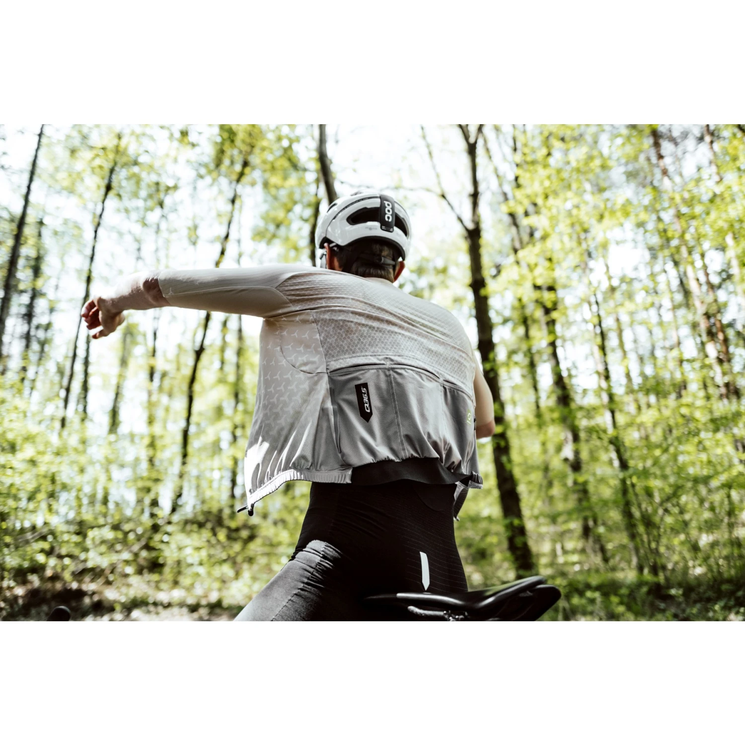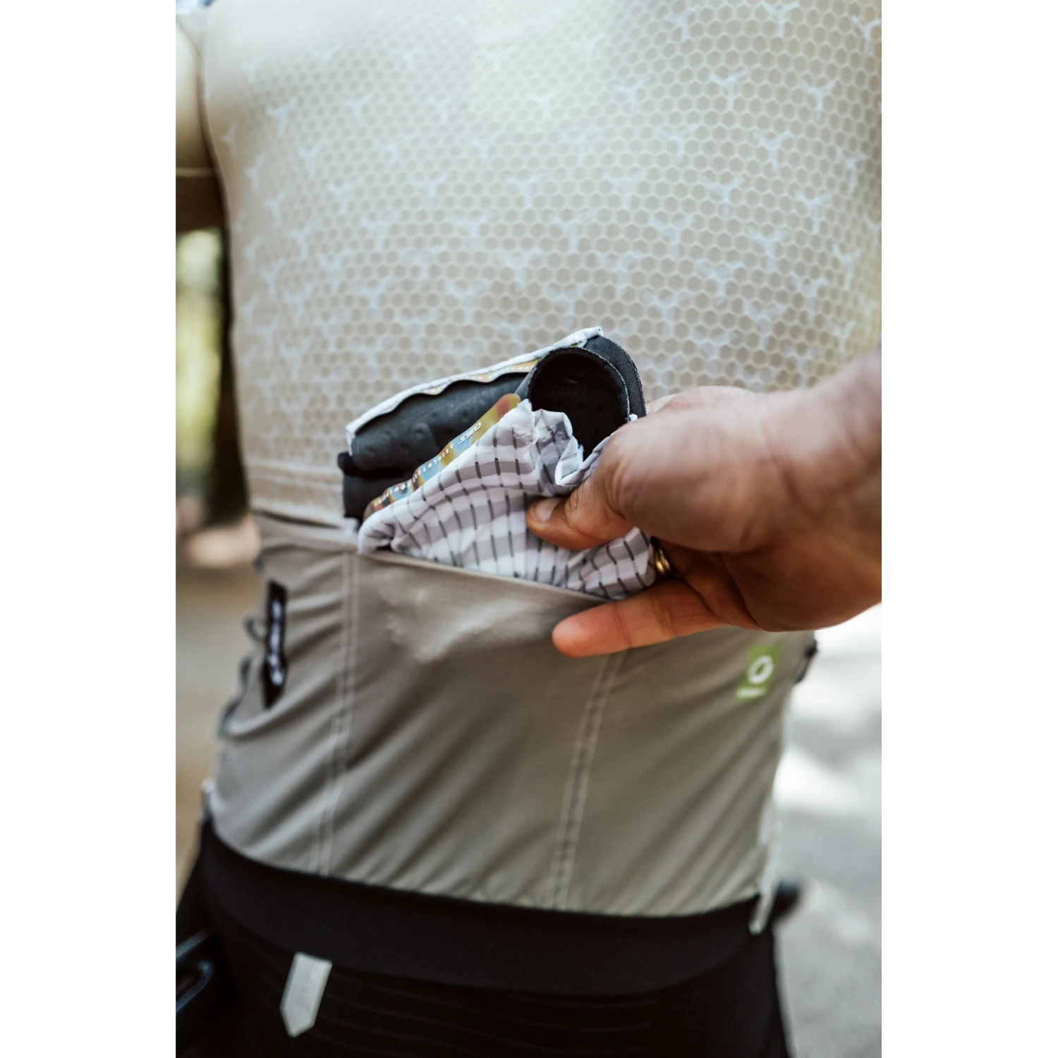 Het resultaat is een shirt waarbij het materiaal niet rimpelt bij de nek, wat irritatie en luchtweerstand kan veroorzaken. Om dit te voorkomen zijn de mouwen gemaakt van een licht geribde stof die niet volledig samenkomt bij de hals. In plaats daarvan begint het rugpand van honingraatgaas bij de hals, loopt het over de schouders en naar beneden naar de bovenste zakken. Dit ontwerp maakt gebruik van de eigenschappen van de materialen om een harmonieuze, efficiënte pasvorm te creëren. Het voorpand is gemaakt van een microgeperforeerd materiaal dat zeer licht en ademend is. Dit extreem lichte shirt weegt slechts 112 gram en biedt een mate van ademend vermogen die u comfortabel houdt tijdens warme zomerritten.