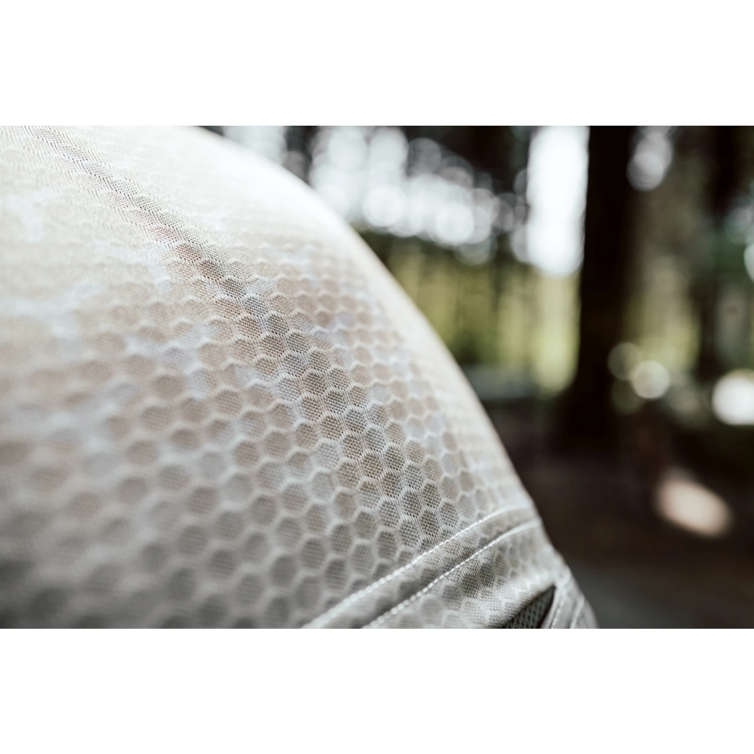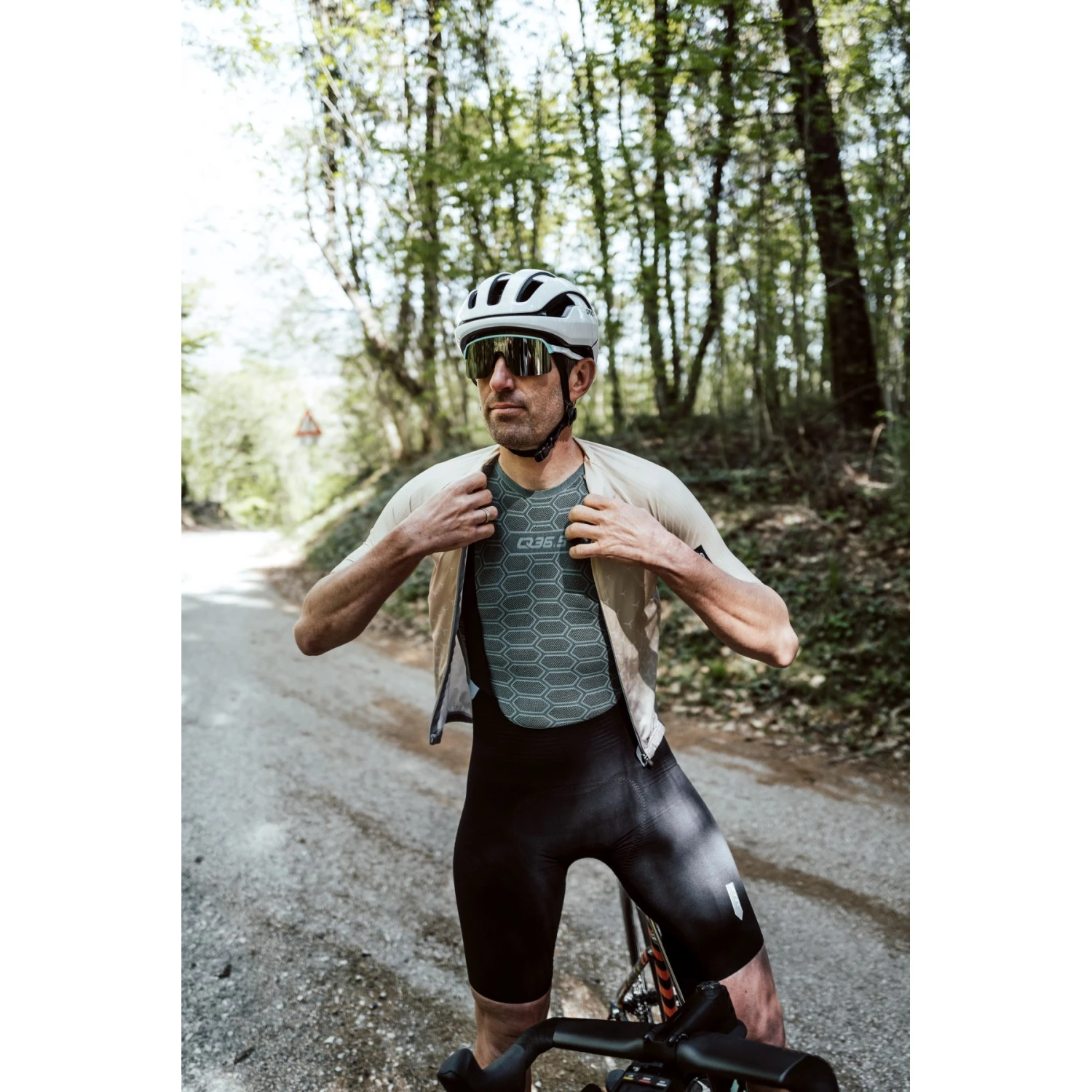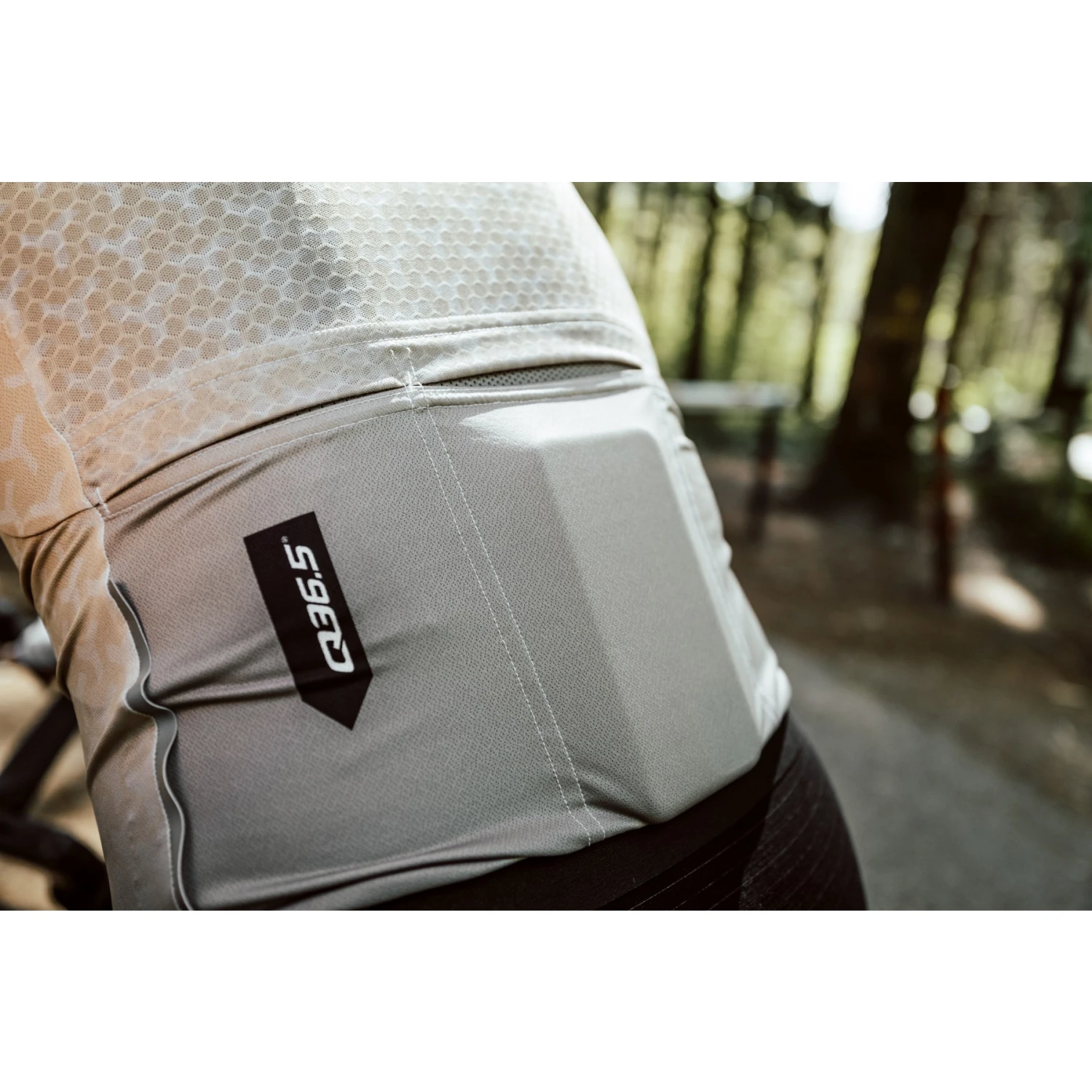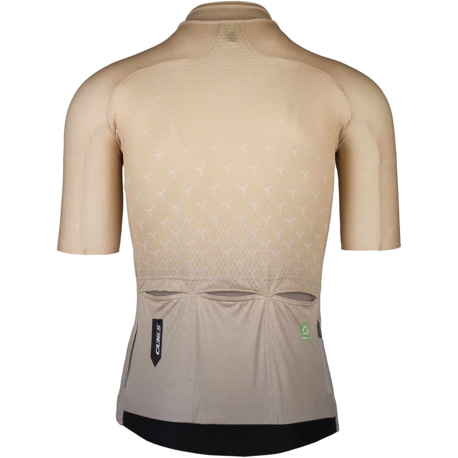 Het resultaat is een shirt waarbij het materiaal niet rimpelt bij de nek, wat irritatie en luchtweerstand kan veroorzaken. Om dit te voorkomen zijn de mouwen gemaakt van een licht geribde stof die niet volledig samenkomt bij de hals. In plaats daarvan begint het rugpand van honingraatgaas bij de hals, loopt het over de schouders en naar beneden naar de bovenste zakken. Dit ontwerp maakt gebruik van de eigenschappen van de materialen om een harmonieuze, efficiënte pasvorm te creëren. Het voorpand is gemaakt van een microgeperforeerd materiaal dat zeer licht en ademend is. Dit extreem lichte shirt weegt slechts 112 gram en biedt een mate van ademend vermogen die u comfortabel houdt tijdens warme zomerritten.