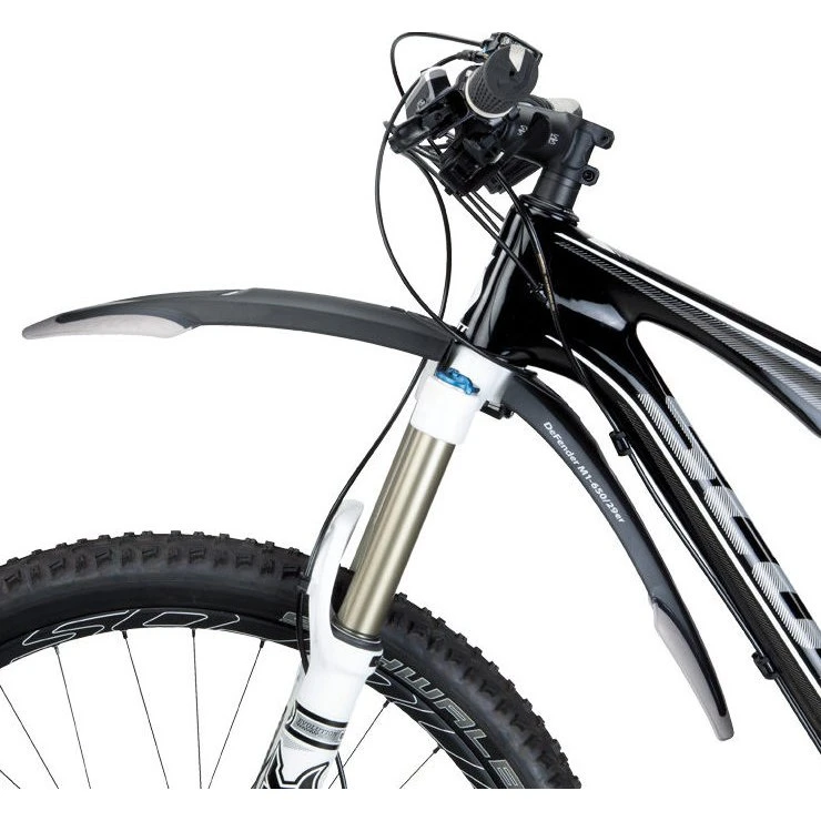 The unique quick release attachment system integrates the DeFender M1 seamlessly with the front of your bike. The M1 front fender is compatible with most front suspension forks including reverse arch designs.
